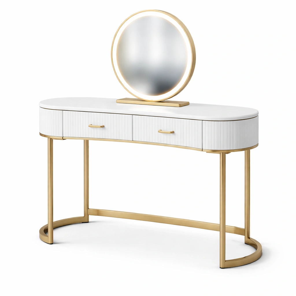Tocador de MDF blanco con espejo LED y estructura de metal dorado